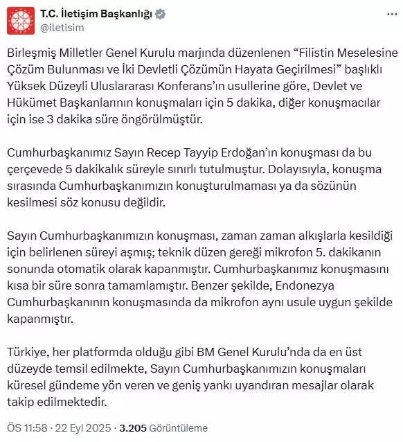 AKP’li Cumhurbaşkanı Erdoğan, BM Genel Kurulu’ndaki Filistin zirvesinde konuşurken ses bir anda kesildi. “Mikrofon mu kapandı?” iddialarıyla ilgili İletişim Başkanlığı’ndan açıklama geldi. Açıklamada 5 dakika sınırı nedeniyle mikrofonun kapatıldığını, aksi bir durumun söz konusu olmadığı belirtildi.