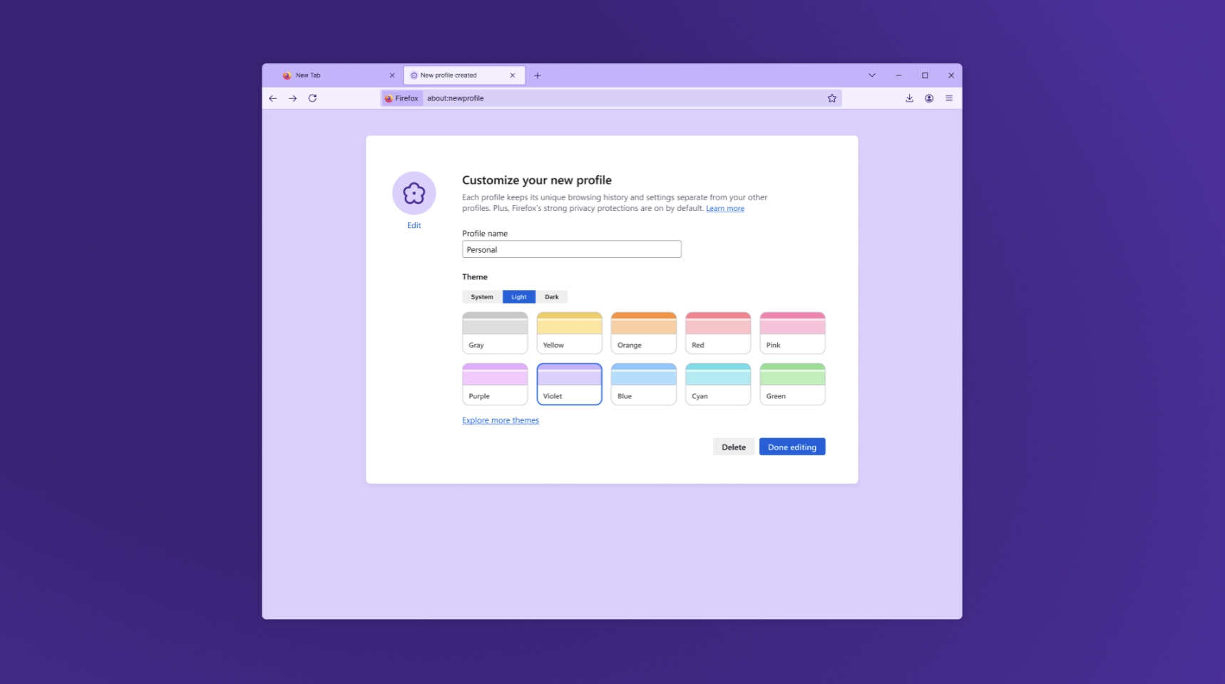 Bir sonraki önemli değişiklik; profil yönetimi. Mozilla kullanıcıları artık tarama verilerini ayrı tutmak için profiller (okul, iş, ev gibi) oluşturabiliyor. Her profili daha kolay tanınması için bir avatar ve renk temasıyla özelleştirebiliyorsunuz. Veriler, sekmeler, tarama geçmişi, yer imleri ve geri kalanı her profilde ayrı oluyor.