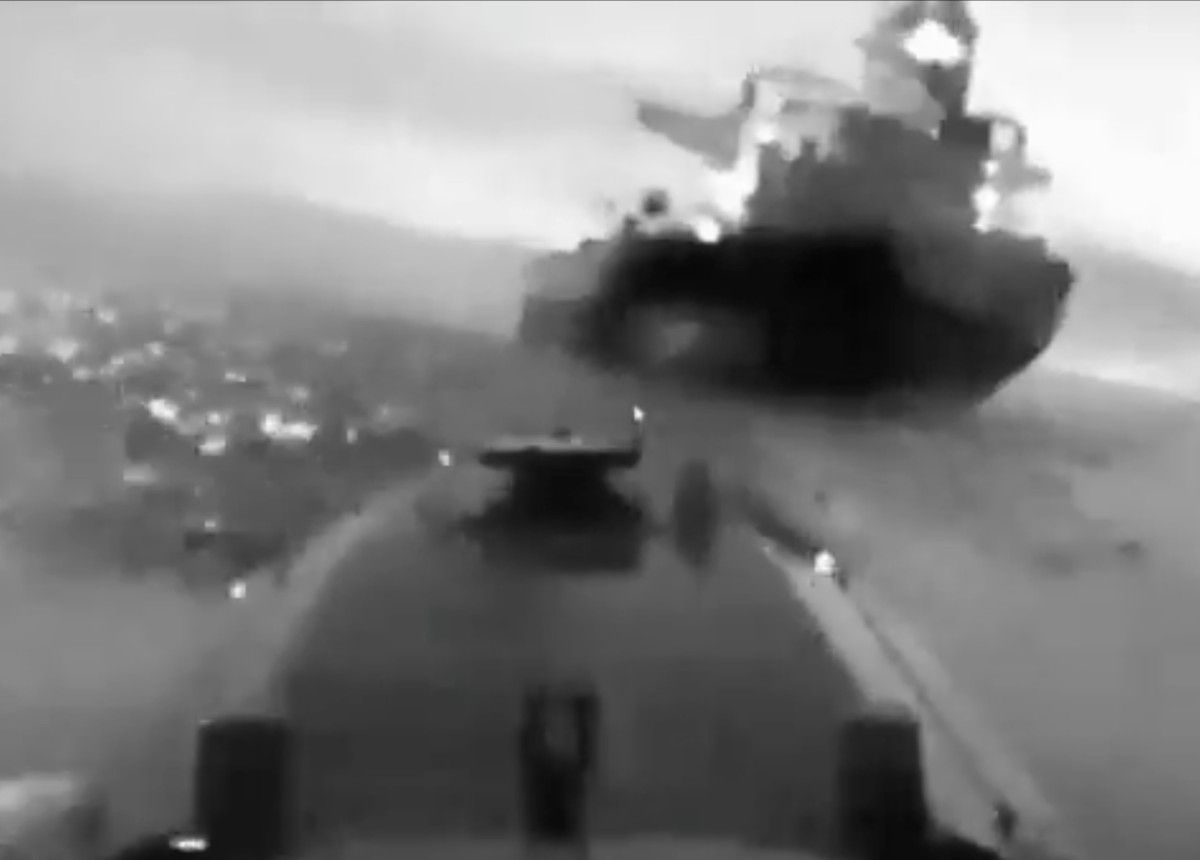 Görüntülerde botun gemiye ilerlediği anlar ve saldırı sonrası gemilerden çıkan yangın anları yer aldı.